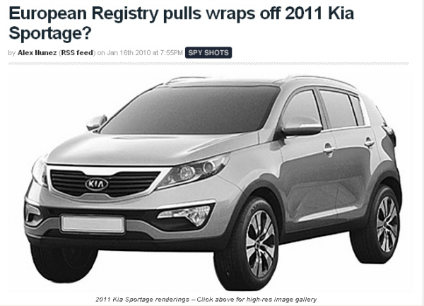 자동차 전문매체인 '오토블로그'는 신형 스포티지의 렌더링 이미지를 공개하면서 이미지가 유럽 의장등록소인 '유러피언 레지스트리'에서 유출됐다고 밝혔다.