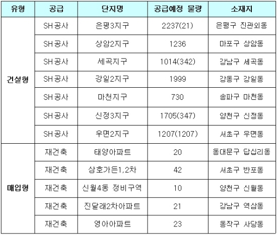 올해 공급계획을 살펴보면 지난 3년 동안 공급한 7884가구보다 많은 1만여가구에 이르고 이중 SH공사 건설형이 1만여가구, 재건축 매입형은 100여호로 계획됐다.