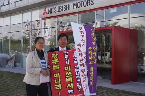| ▲ 김선호 광주효광중교장이 미쓰비시자동차 광주전시장 앞에서 1인 시위를 하고 있다. 왼쪽은 이금주 광주유족회장. ⓒ시민모임 카페 발췌. |