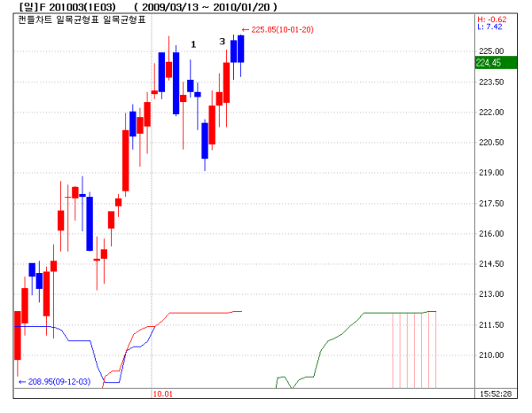주가 상승 확장에도 조정이 단축되지 않을 경우의 계산은 매수세가 매도세로 전부 전환되는 것이다. 1양봉과 3양봉이 모두 매도로 전환될 경우는 4음봉이 된다.