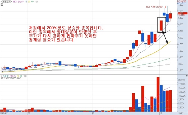 아마 지금까지 차트연재를 읽어보신 분은 이런 의문을 가졌을 것입니다. 어제는 장대양봉을 주목하고 하더니 오늘은 장대양봉을 조심하라고 하니 어리둥절하신 분도 계실 것입니다.
