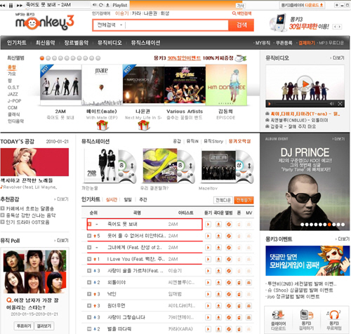 [프라임경제] 2AM의 ‘죽어도 못 보내’는 음악전문사이트 몽키3(www.monkey3.co.kr) 실시간차트에서 줄곧 1위를 지키고 있던 씨엔블루의 ‘외톨이야’를 누르고 1위를 차지했다.