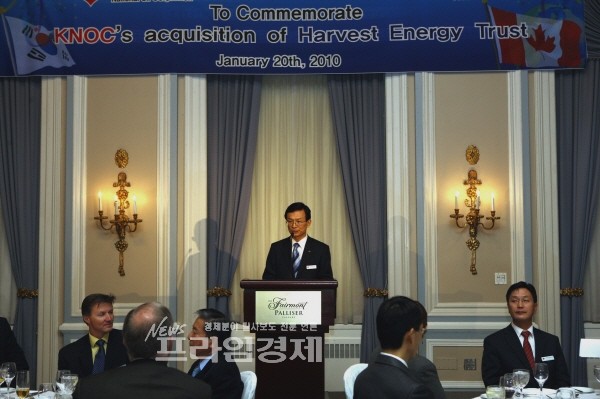 [프라임경제]석유공사 강영원 사장이 20일 캐나다 팔리저 호텔에서 개최된 하베스트사 인수 기념식에서 연설을 하고 있다.