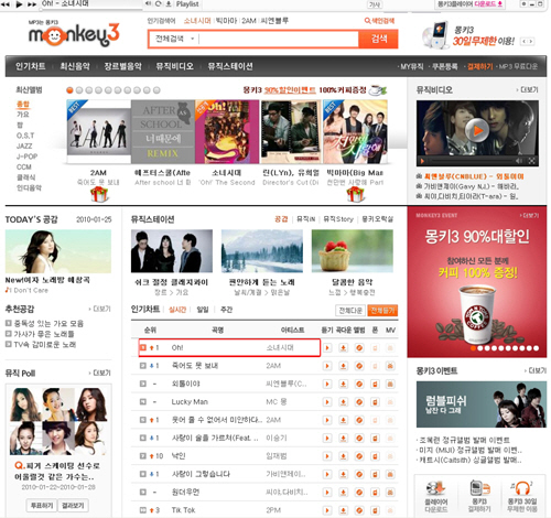 소녀시대의 ‘Oh(오)’가 음악전문사이트 몽키3(www.monkey3.co.kr)에서 25일 10시에 공개되자마자 단숨에 몽키3 실시간차트 1위에 오르며 폭발적인 반응을 보이고 있다.