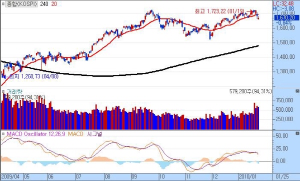 주가 하락의 직접적 원인은 1월 21일 발표된 오바마의 금융기관에 대한 위험투자 규제방안에서 출발하고 있지만, 급락의 이면에 4/4분기 실적에 대한 실망, 중국발 긴축, 그리고 유럽 금융불안과 오는 31일 임기 만료되는 버냉키 미국 연방의장의 연임 실패 가능성 등 다양한 요인이 맞물려 있어 앞으로의 시장흐름을 예측하기가 쉽지 않다.