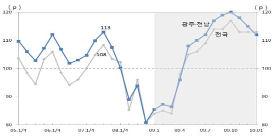 | 광주·전남지역 소비자심리지수(CCSI)추이 <한국은행 제공> |