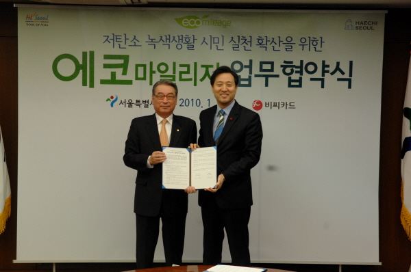<사진=비씨카드 장형덕 사장(좌측)은 27일 오전 서울시청에서 오세훈 서울특별시장과 에코마일리지 카드 사업에 관한 협약을 체결했다.> |