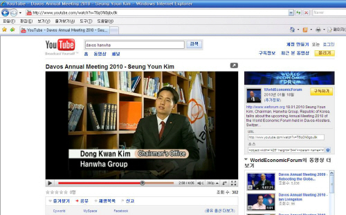 | <사진설명 = 유튜브, 다보스포럼 홈페이지를 통해 경영 소신을 밝히고 있는 김동관 한화 차장. 사진은 동영상 캡쳐.> | ||