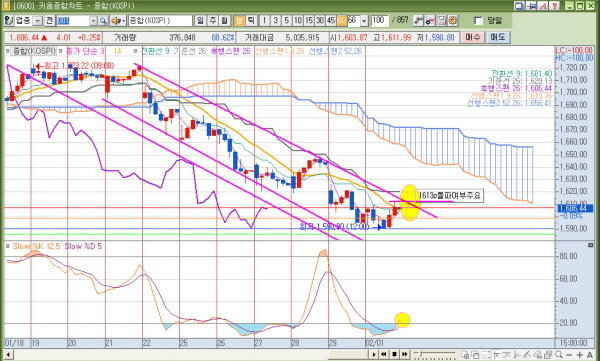 시초1,612p돌파에 실패한다면 1차1,605p 2차1,591p 3차1,581p 4차1,570p 5차1,557p까지의 추세하락으로 대응하되, 장중60분봉 중심선이 수평 값을 유지하면 상승에 동참 하고, 반등 시 고점매도는 당분간 유효하다 하겠습니다.