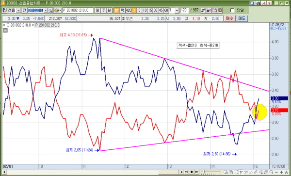 “옵션 콜210 3.45돌파여부중요 풋2.97지지여부 체크하자”