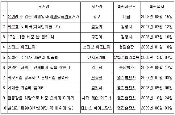 <‘청소년, 롤 모델을 만나다’ 추천도서 1~10위 목록> |