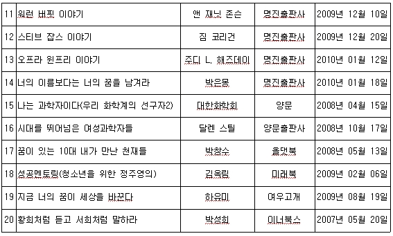 <‘청소년, 롤 모델을 만나다’ 추천도서 11~20위 목록> |