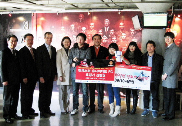 | <2일, 맨유 카페바 종로점이 오픈기념 이벤트를 통해 당첨된 행운의 주인공들에게 맨유 홈경기 관람권등을 제공했다.> |