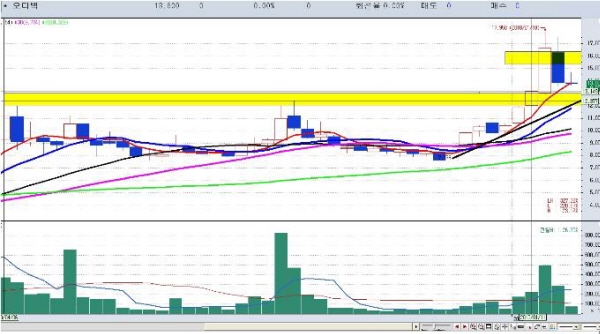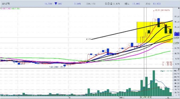 일봉 차트 기술적 분석상 상승 추세대의 하단부인 13,000원 지지가 중요하며 매수 유망가는 12,300~13,500원 목표가는 16,000원 이다.