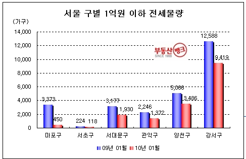 3일 부동산정보업체 부동산뱅크에 따르면 2010년 2월 현재 서울시 내 1억원 이하 전세아파트는 475개 단지 12만6609가구로 조사됐다. 이는 작년 같은 시점에 비해 -21.94%(16만2192→12만6609가구) 감소한 수치로 무려 3만5583가구가 줄어든 것이다.