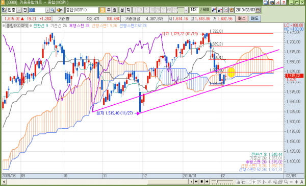 목요일 코스피시장은 일봉 전환선이 가빠르게 우 하향으로 이동하면서 상승 시 반등제약은 있을 수 있으나 장중 1,617p돌파지지 한다면 1차1,621p 2차1,630p 3차1,645p까지의 상승에 대비하되, 240분봉 상방마디가인 1631p 돌파에 실패한다면 장중 매도 대응 후 1,621p까지의 하락에 대비합니다. 지지시는 저점매수 와 고점매도의 장중 등락을 이용한 데이트레딩이 필요하며, 1,613p이탈 시는 1차 1,608p 2차1,595 3차1,591p까지 하락에 대비하되 구간마다 지지되는 모습이면 추세하락 보다는 장중 조정은 저점매수의 기회로 보면서 단기적으로는 1,660~1,670p까지의 상승에 역점을 두고 1,591p붕괴 시는 1차1,557p 2차1,516p까지의 추세 하락도 염두에 두면서 시장에 대응합니다.