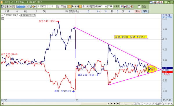 “옵션 콜210 3.40돌파여부중요 풋212.5 2.90지지여부 체크하자”