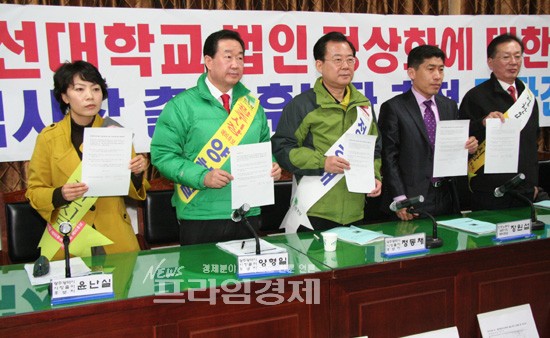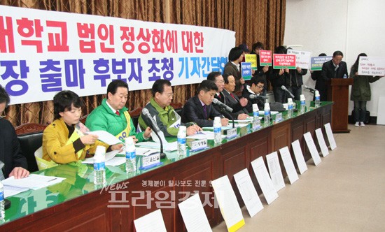 [프라임경제]광주시장 출마 예비후보자들이 4일 정이사 선임문제 등으로 교육과학기술부와 진통을 겪고 있는 조선대학교에 모여 “비리경영 등으로 퇴출된 박철웅 일가의 정이사 참여는 잘못된 것이다”고 입을 모았다.