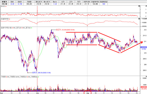 선물 차트의 움직임을 살펴보면 어제의 박스권 흐름을 일부 이어나가다가 중국 시장 개장 이후에 하락 추세로 흐름을 바꾸는 것을 확인할 수 있습니다. 오후에는 중국과 일본 시장이 반등을 하자 우리 코스피는 따라서 반등을 하는데 성공을 했지만, 주식시장보다 15분 늦게 마감하는 선물시장은 중국이 하락으로 코스피는 상승, 선물은 하락으로 마감한 하루였습니다.