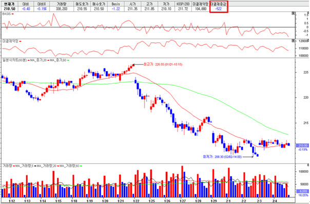 오늘은 전일 대비 0.19% 하락한 210.50pt로 지수를 마감했습니다. 거래대금은 전일 보다 적은 35조6,718억원으로 마쳤습니다. 전일 미국증시는 1월 ISM서비스지수가 시장 예상치 보다 좋지 못했다는 점과 헬스케어주들이 약세를 나타내면서 다우존스는 하락을 했고, 장 후반 기술주가 강세를 나타내면서 나스닥은 상승하는 혼조로 마감했습니다.