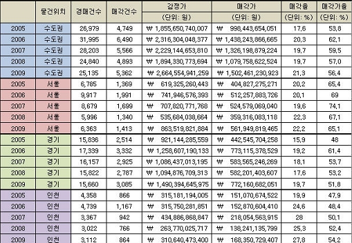이는 2009년 매각건수당 평균 감정가가 2008년에 비해 약1억900만원 높아진 것으로 볼때 우량물건이 경매시장에 많이 등장한 것으로 보이지만 매각건수당 평균 매각가는 약 6000만원 오른 것에 그쳐 투자자들의 패턴이 점차 보수적이고 신중한 투자방식으로 변하고 있는 것으로 보인다.