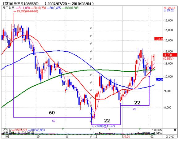 기술적 분석으로 본다면, 3개월 60일 동안 하락했으며, 다시 월초 마다 상승하는 주기변곡이 나타나고 있어조만간 전고점 돌파가 가능하다고 분석했다.