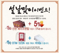 특별한 설 선물을 고민하는 고객들을 위해 마련된 이번 바이온텍 설날맞이 이벤트는 그 동안 가격부담 때문에 이온수기 구입을 망설이던 고객들이 이온수기를 알뜰하게 장만 할 수 있는 기회를 제공하는 것은 물론, 특히 부모님 건강을 위한 효도 선물을 찾는 고객들에게 안성맞춤 구입 기회가 될 전망이다.