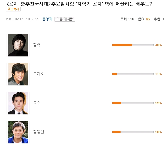 이어, 드라마 ‘크리스마스에 눈이 온다면’에서 완벽주의자 건축가로 열연했던 고수가 22%의 지지를 받으며 장혁에 뒤를 이어 2위를 차지했고 국내 최고의 톱스타 장동건이 20%의 투표율로 3위, 장혁과 함께 ‘추노’에서 열연하고 있는 오지호가 4위에 올라 눈길을 끌었다.