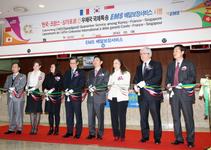 [프라임경제]남궁 민 우정사업본부장(오른쪽 네 번째)과 엘리자베스 로행 프랑스 대사(오른쪽 세 번째), 추아 타이 컹 싱가포르 대사(오른쪽 다섯 번째)가 8일 서울 중앙우체국에서 열린 ‘한국-프랑스, 한국-싱가포르간 우체국 국제특송 배달보장서비스 시행’ 기념식에서 테이프 커팅을 하고 있다. <사진제공 : 우정사업본부>