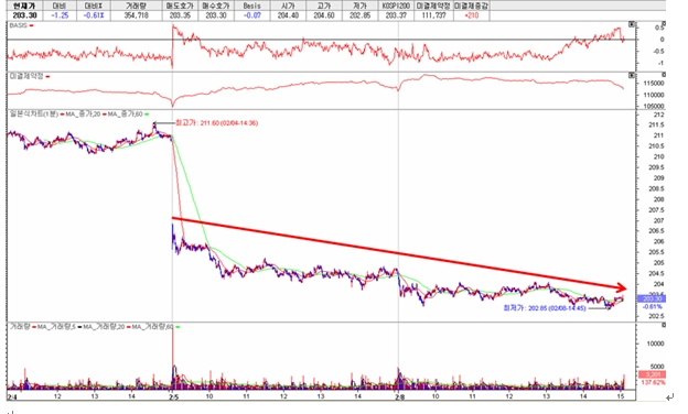 이번 주 옵션만기일이 변곡점으로 작용을 할지는 계속해서 지수를 주시해야 할 것으로 보입니다. 새로운 한 주를 시작하는 월요일 주가는 여전히 하방의 가능성을 많이 내포하고 있기 때문에 선물 매매자는 매도포지션으로 대응하는 전략이 필요할 것으로 보입니다.