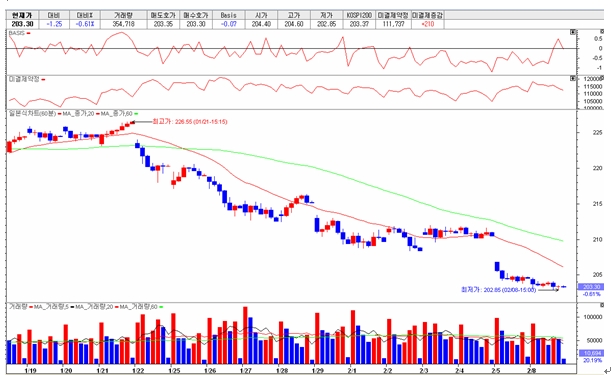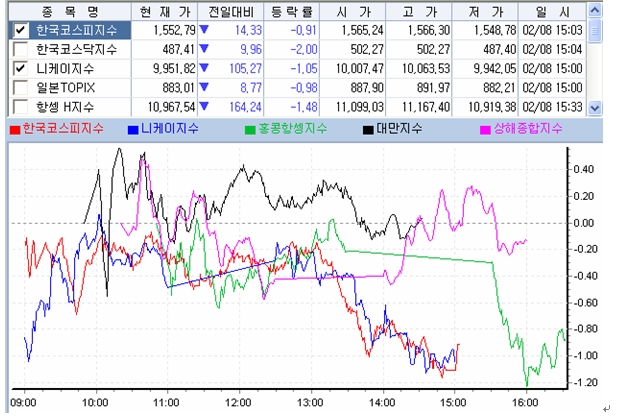 오늘은 전일 대비 0.61% 하락한 203.30pt로 지수를 마감했습니다. 거래대금은 전일 보다 적은 36조1,009억원으로 마쳤습니다. 지난 금요일 미국증시는 1월 비농업부문의 신규고용지표의 악화로 약세로 시작했지만 장 후반 기술주를 중심으로 상승을 하면서 10,000포인트를 가까스로 지켜냈습니다. 우리 코스피는 0.91% 하락한 1,552.79pt로 지수를 마감했습니다.