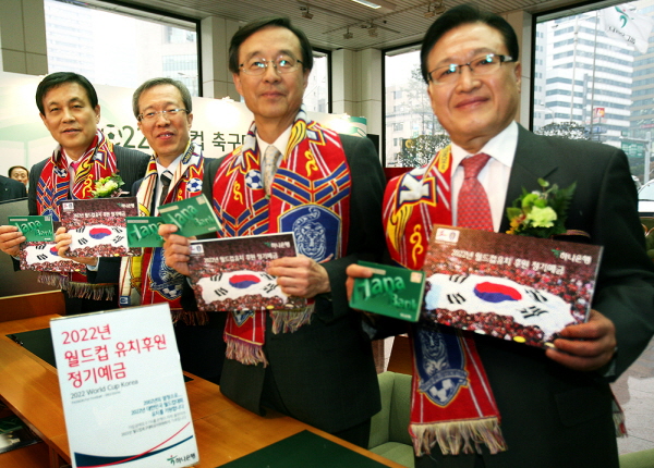하나은행은 9일 서울 을지로 본점에서 조인식을 열고 2022년 월드컵 유치후원 정기예금 상품 가입행사도 가졌다. 이로써 하나은행은 1998년부터 축구국가대표팀을 후원하게 됐다.