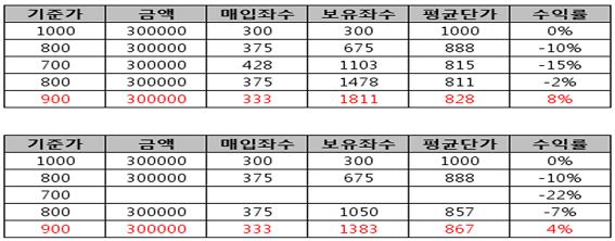 기준가를 종합주가지수라고 생각하고 표를 보면 보다 이해가 쉬울 것이다. 위쪽 표는 주가에 상관없이 30만원씩 꾸준히 펀드에 불입한 경우고, 아래쪽 표는 주가가 700포인트까지 떨어지자 불입을 한번 중단한 경우다.