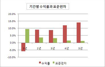 분석결과에 따르면 펀드에 투자하는 기간이 길어질수록 표준편차가 작아지는 것을 알 수 있다. 표준편차가 작아진다는 것은 갑작스럽게 수익률의 변동이 발생할 확률이 적어진다는 것을 말한다.