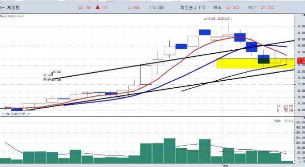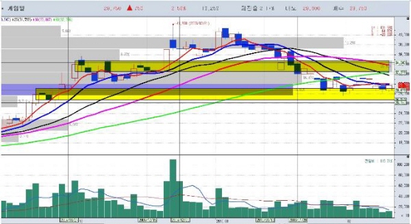 일봉 차트의 기술적 분석상 상승 후 안정적 조정을 보이고 있고 26,700원 지지가 중요하며 매수가는 27,000원~29,000원, 목표가는 단기 32,000원~33000원 손절가는 26,000원으로 예상된다.
