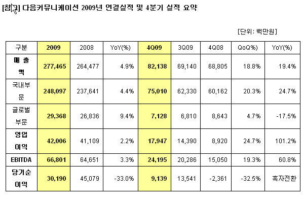 다음의 2009년 4분기 매출은 전통적인 광고시장 성수기와 경기회복 기대감으로 인한 광고주의 광고집행 증가와 쇼핑비즈니스의 높은 성장을 통해 분기 사상 최초로 700억 원을 돌파했다.