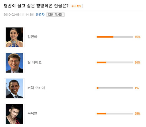 내게도 누군가의 인생이 반복된다면, 어떤 인물의 평행이론이 좋을까?! 네티즌들은 자신들이 살고 싶은 ‘평행이론’ 인물로 빌 게이츠, 버락 오바마, 2PM의 택연을 제치고, 스포츠스타 김연아를 1위로 꼽았다.