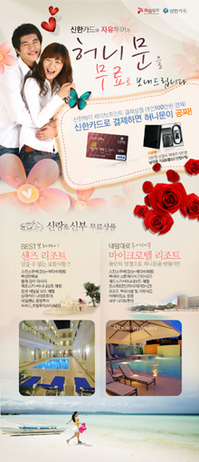 조건은 신한하이 세이브 포인트 카드로 1인 금액에 해당되는 100만원 상당의 허니문 상품을 결제하고, 이후 일정기간 카드 사용실적에 따라 적립되는 포인트로 금액 상환하면 되는 것. 단 무료로 다녀올 수 있는 상품은 보라카이의 샌즈 리조트와 세부의 마이크로텔 리조트에 한해서이다.