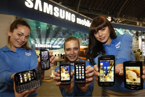 | ▲ 스페인 바르셀로나에서 열리는 세계 최대 정보통신전시회인 ‘모바일 월드 콩그레스(MWC) 2010’에서 삼성전자 도우미들이 삼성전자 전시장에서 첨단 프리미엄 전략 스마트폰 ‘웨이브(가운데)’ 등 다양한 첨단 휴대폰을 선보이고 있다. |