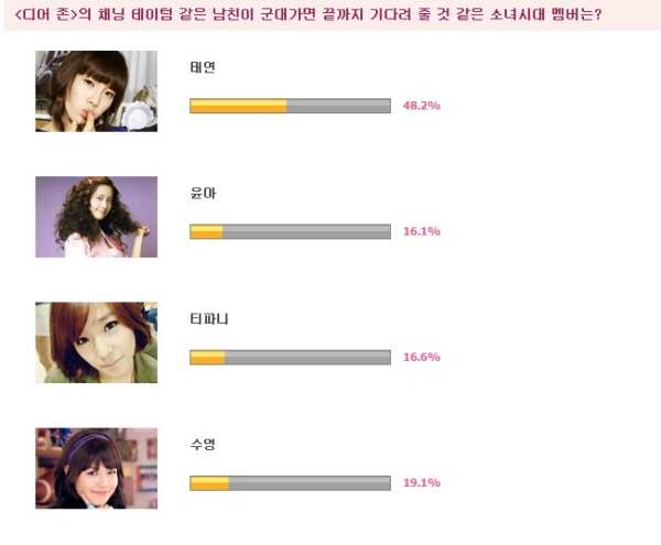 48.2%라는 압도적인 지지율로 ‘남친이 군대가면 끝까지 기다려 줄 것 같은 소녀시대 멤버 1위’에 뽑힌 태연에게 설문에 참여한 네티즌들은 “태연, 왠지 끝까지 기다릴 듯!”, “태연이 의리 있을 것 같아요!”, “태연이 순정파일 것 같아서” 등의 댓글을 남기기도 했다.