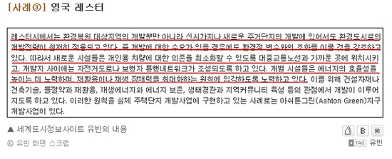 아래의 스크랩은 세계도시정보 사이트 유빈에 올라와 있는 영국 레스터 관련 내용이고, 인용문은 강 의원이 쓴 '환경생태, 영국 레스터' 229쪽 내용이다.