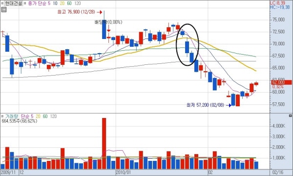 그러다 주가가 갑자기 급락을 하면서 흑삼병이 출현합니다. 주가가 흑삼병을 만들면서 계속 떨어지니까 지지 구간을 찾아야 하는데 밑에 20일선이 없습니다. 주가가 20일선 위에서 움직이다가 하락했기 때문이죠.