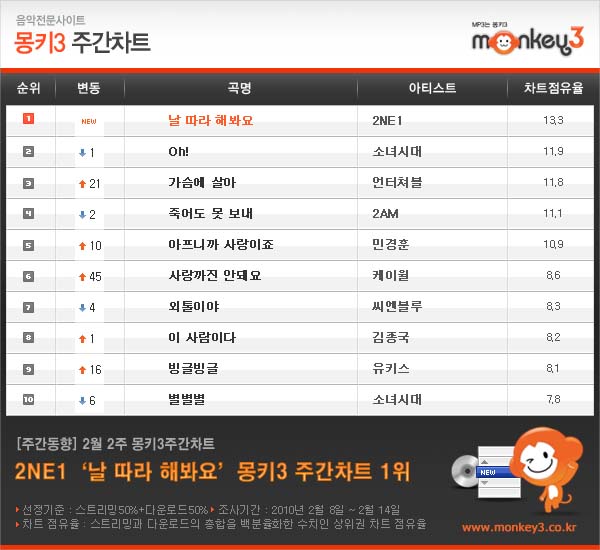 [프라임경제] 음악전문사이트 몽키3(www.monkey3.co.kr)의 2월 둘째 주(2월 8일~14일) 주간차트에서 2NE1의 신곡 ‘날 따라 해봐요’가 차트 1위로 핫샷 데뷔했다.
