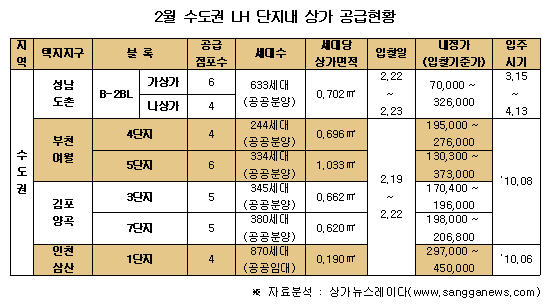이번에 공급되는 상가를 지역별로 세분화 하면 성남 도촌 B-2블록(5단지)에서 10개, 김포 양곡 3, 7단지에서 각각 5개, 부천 여월 4단지 4개, 부천 여월 5단지 6개 그리고 인천 삼산 1단지 4개가 공급예정이다.