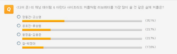 최근 당당하게 연인임을 선언한 장동건과 고소영은 지난 2월 5일부터 12일까지 온라인 사이트 곰TV에서 실시한 이번 설문조사에서 35.1%의 높은 지지율을 보이며 1위를 차지했다.