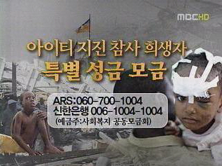 | < 사진 = TV에 소개되는 ARS구호 기금 안내화면. TV상단에 소개되는 ARS기부 역시 영수증 발급이 가능하다> | ||