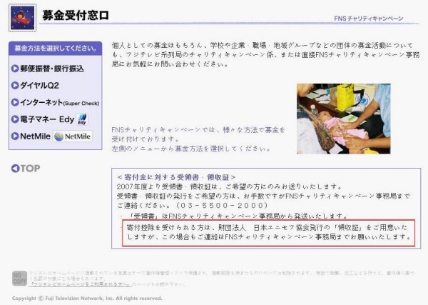 | <사진 = "기부 공제를 받으실 분은 재단법인 일본 유니세프 협회가 발행한 「영수증」을 드리겠습니다. 연락은 방송국 FNS자선 캠페인 사무국으로 해주시기 바랍니다"라고 명시돼있다> | ||