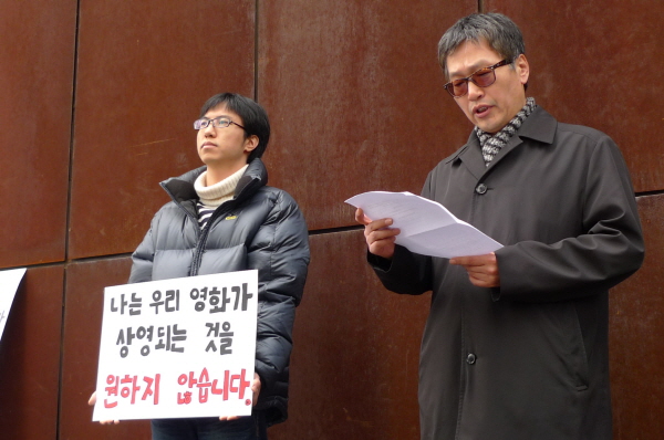 <1인 시위 지지 성명을 낭독중인 황규덕 감독> |