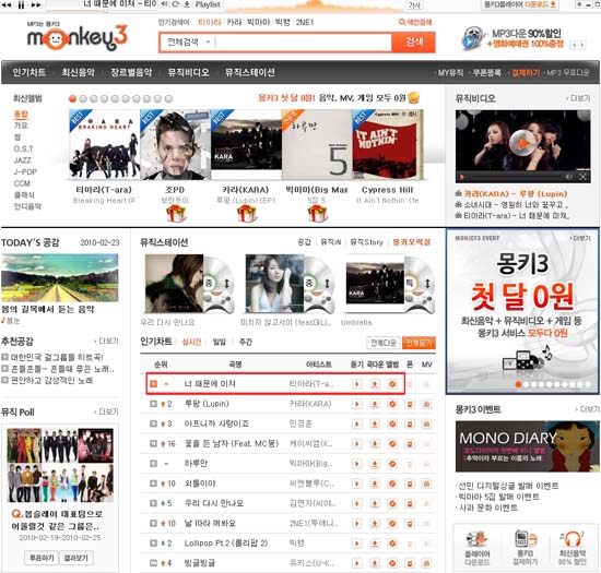음악전문사이트 몽키3(www.monkey3.co.kr)가 23일 오후2시까지 집계한 실시간차트에서 티아라의 ‘너 때문에 미쳐’가 소녀시대, 2NE1, 카라를 밀어내고 1위로 올라섰다.