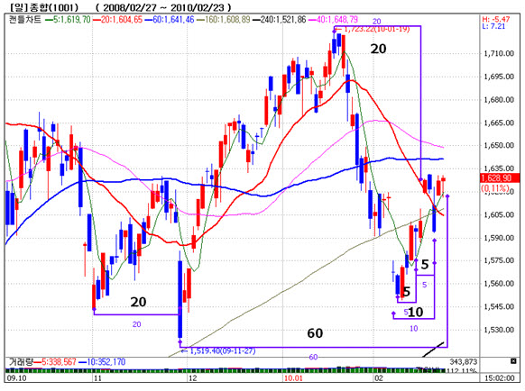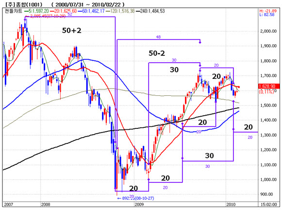 그는 일봉상으로 20일 주기가 주가의 변곡과 일치라는 경향이 많다면서,"11월초와 11월 말도 20일 주기 쌍바닥이며, 1월 중순 고점에서 20일이 되는 구간에서 20일선을 돌파했다"라는 사실에 주목해야 한다 라고 설명했다. 덧붙여, 향후 1660저항과 60일선 돌파와 안착과정이 일어날 수 있다고 언급했다.